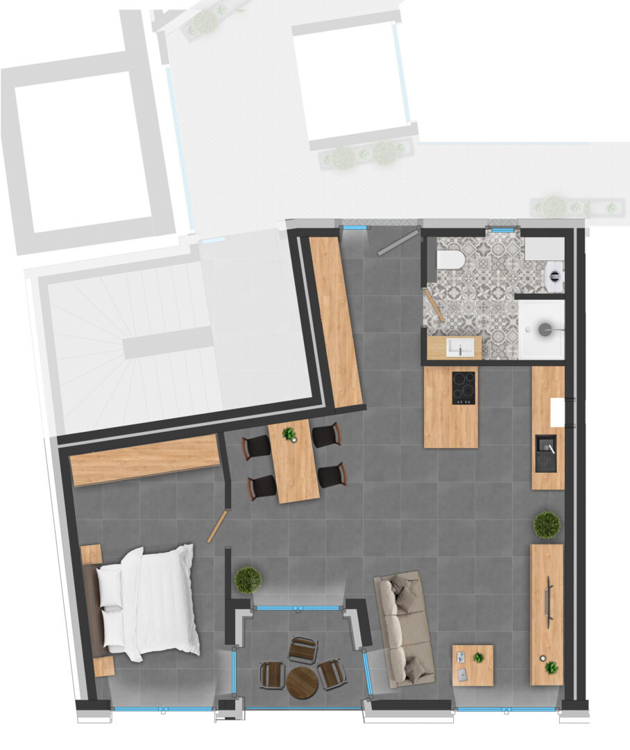 Each flat has an A++ energy efficiency rating, ensuring efficiency and environmental protection. Features include electric blinds, walk-in showers, carefully selected colours, a fully equipped kitchen and a comfortable bathroom.